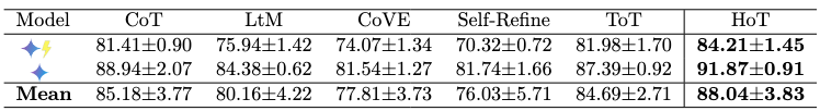 On average over 5 runs and 3 datasets, HoT alone is still the most performing method compared to all other advanced prompting methods of CoT, LtM, CoVE, Self-Refine, and ToT. Under other prompting techniques, we observe LLMs often miss critical facts (e.g., overlooking temporal indicators like "yesterday" in Date), causing incorrect answers. In contrast, LLMs tend to focus better on key facts under HoT prompting.