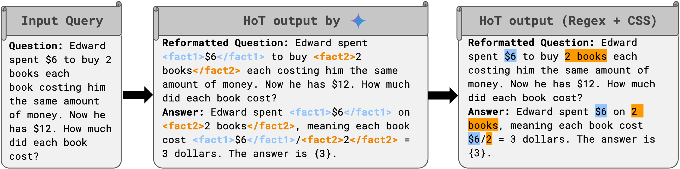 LLMs generate HoT responses by wrapping XML tags around the information that the model determines is the most important. Regex and CSS are then used to add color highlighting for the user to easily understand the response.