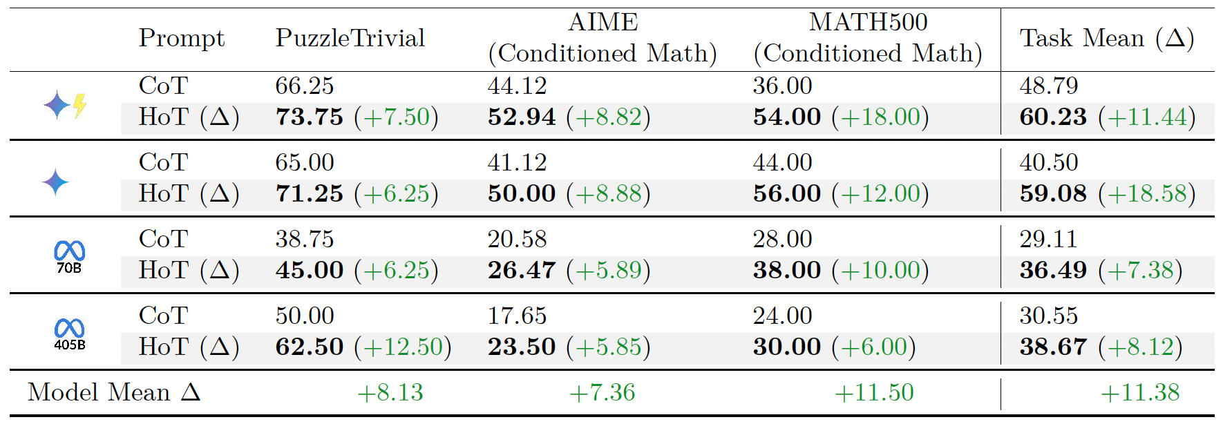 We evaluate HoT on 22 tasks across arithmetic, question-answering, and logical reasoning datasets using Gemini-1.5-Pro (